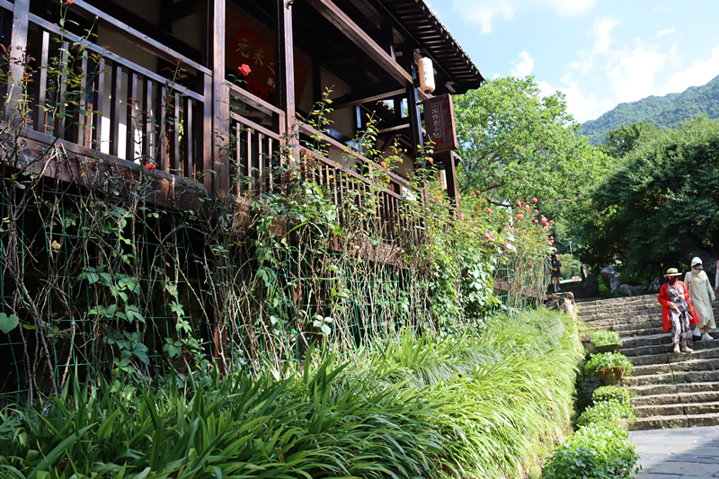 午后的陽(yáng)光灑在飛檐翹角的古建筑上,溪水潺潺,燈籠輕搖,高空索道穿云破霧,扶搖直上。隨著海拔升高,視野豁然開(kāi)朗。腳下是翻滾涌動(dòng)的云海,如夢(mèng)似幻;遠(yuǎn)處是層巒疊嶂的翠峰,如詩(shī)如畫(huà),穿梭于云霧之中,宛如置身仙境!
